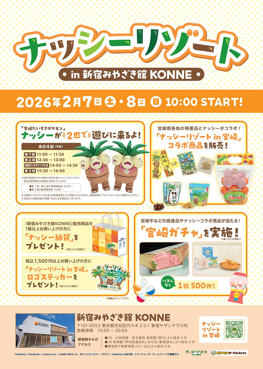 「宮崎だいすきポケモン」ナッシーが新宿に登場! ナッシーリゾートin新宿みやざき館KONNE 開催期間:2026年2月7日(土)・8日(日)10:00 START! 開催場所:新宿みやざき館KONNE(宮崎県アンテナショップ)
